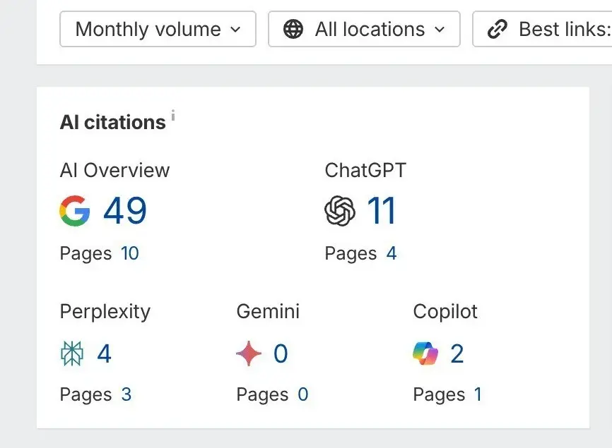 Приводим скрин статистики (скриншот 1). Там всё максимально приземлённо и честно: Google AI Overview - 49 цитирований (и что важно: 10 страниц сайта участвуют как источники), ChatGPT - 11 (4 страницы), Perplexity - 4 (3 страницы), Copilot - 2 (1 страница), Gemini - 0. И да, ноль по Gemini - нормальная история: т.к. доступ к сервису достаточно сильно затруднен и не решается только одним (слово из трёх букв, запрещено в РФ). Важно другое: мы стали источником!